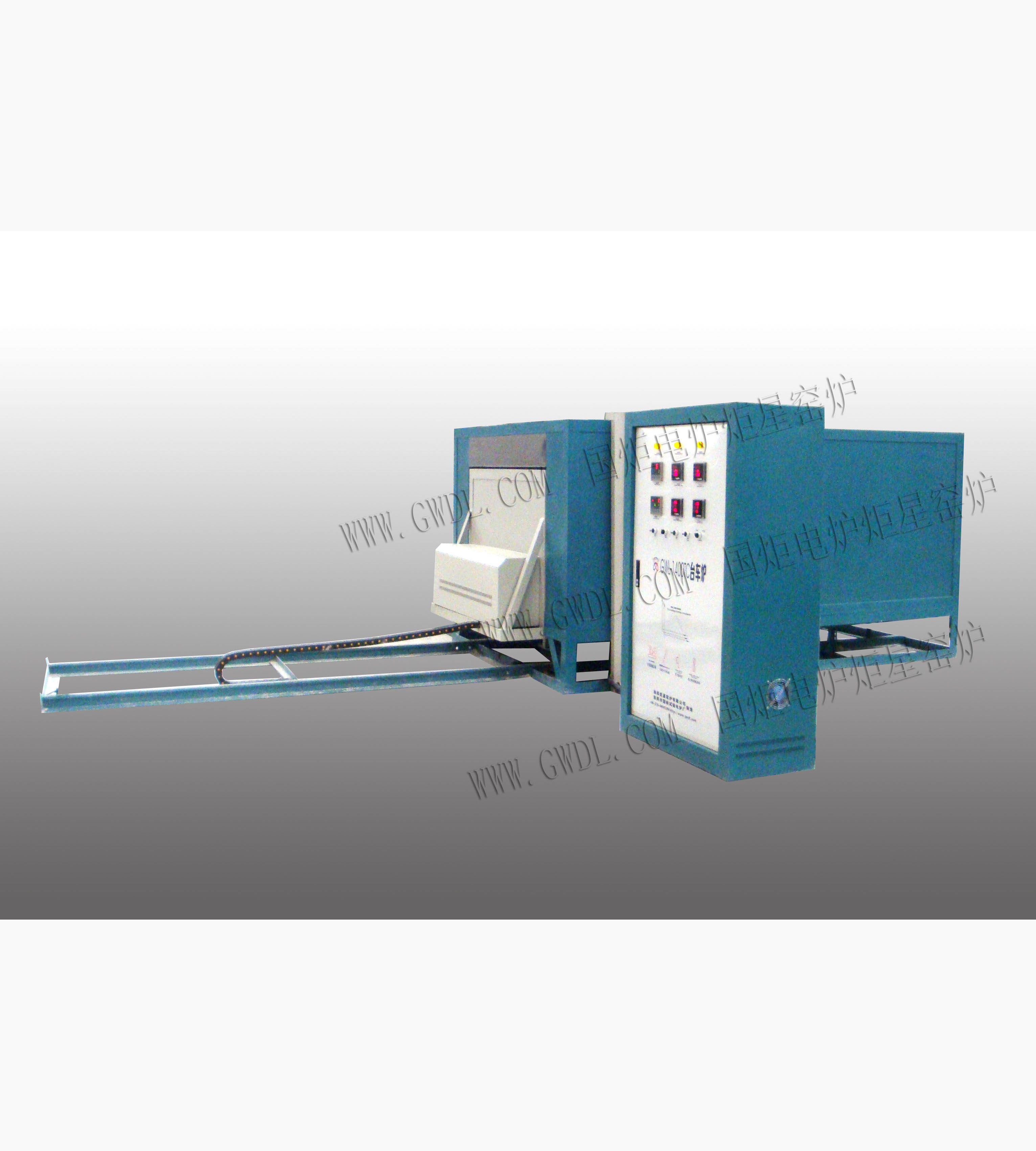 GWL-STCY系列1200度一體爐門臺(tái)車爐如圖所示,集控制系統(tǒng)與爐膛為分體。爐襯使用真空成型高純氧化鋁聚輕材料。
